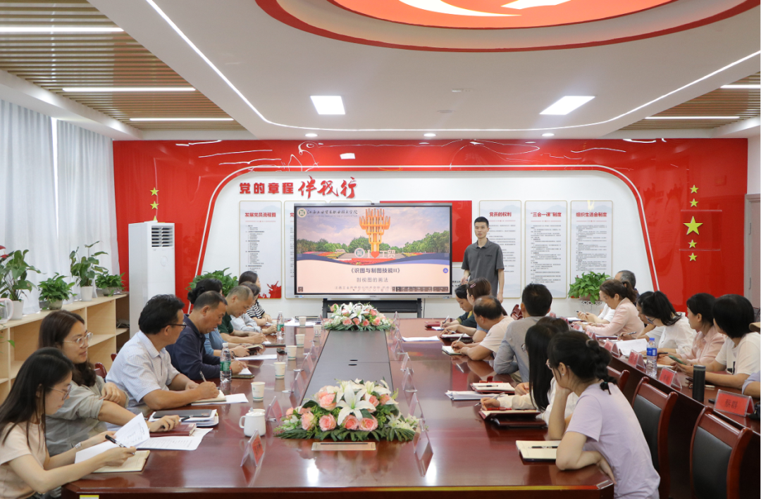 本学期机电工程系新教师钟传枝是教学能力提升帮扶老师,钟老师选取本学期正在教授的《识图与制图技能Ⅱ》课程,以全剖视图概念、表达方法、案例练习、注意事项等四个部分内容进行模拟实际教学和展示。授课过程采取动画、实物、软件操作等相结合,做学结合,展示年青教师对数字化资源融入教学的操作技能。