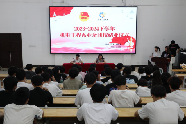 为深入贯彻落实习近平总书记对青年学生的教诲,推动党的二十大精神在青年学生中走深走实,团结引领广大青年感党恩、听党话、跟党走。坚定入团积极分子的信念,积极选拔优秀青年学生加入团组织,共同为党和人民事业贡献力量。 机电工程系团总支于5月9日-5月23日期间开展了2023-2024下学期业余团校,授课教师们以2024年全国两会精神为指引,深入阐释团章团史、两会精神核心、建党精神内涵以及新时代大学生应具备的政治修养和综合能力,相关课程已全面完成,同学们普遍表示收获颇丰。 系团总支于6月6日在乐学楼209举行了机电工程系2023-2024下学期业余团校结业典礼暨入团仪式。参加本次会议的有机电工程系光明党支部副书记、副主任晏慧敏和团总支书记王卉怡老师。