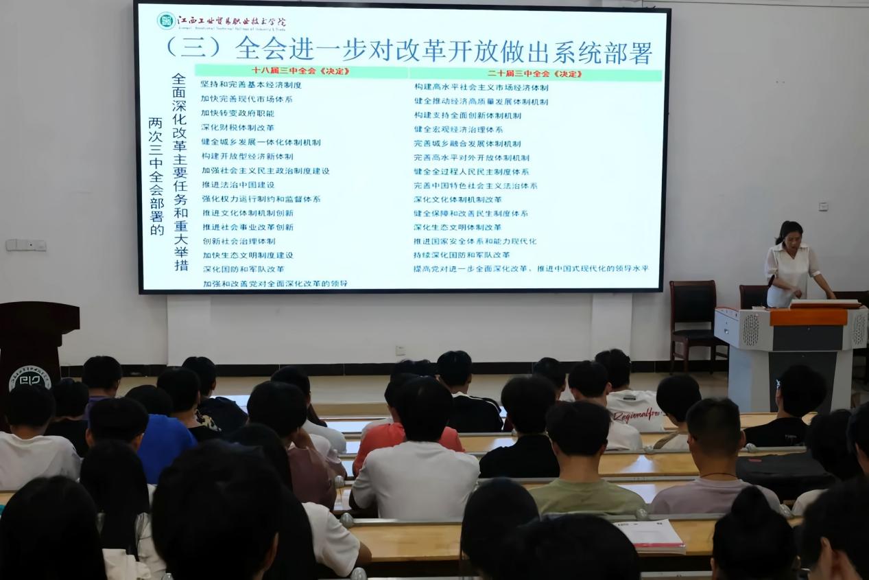 为深入学习贯彻党的二十届三中全会精神,进一步推动全面深化改革,推进中国式现代化进程,机电工程系党支部文艺委员周金莲同志,于2024年10月10日中午12:40在乐学楼209为2023级机械制造及自动化1班和2023级电气自动化技术1班的同学们开展“学习贯彻党的二十届三中全会精神”专题宣讲。