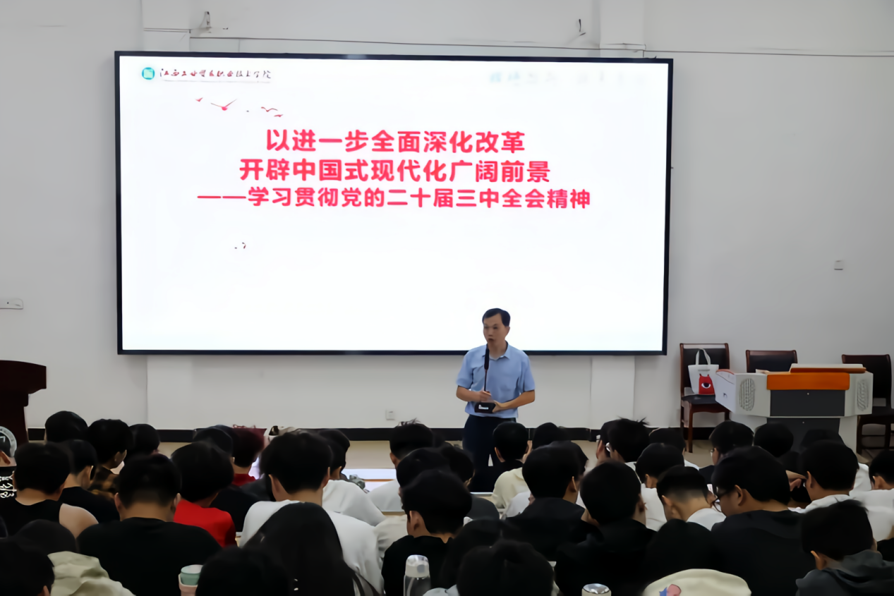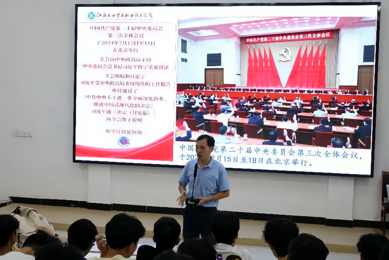 为深入学习贯彻党的二十届三中全会精神,机电工程系党支部统战委员谢晖同志,于2024年10月15日中午12:40在乐学楼209为23新能源汽车技术1班和23机械制造及自动化2班的103名学生开展“学习贯彻党的二十届三中全会精神”专题宣讲,帮助他们深入理解党的最新政策导向,激发学习热情,明确未来发展方向。
