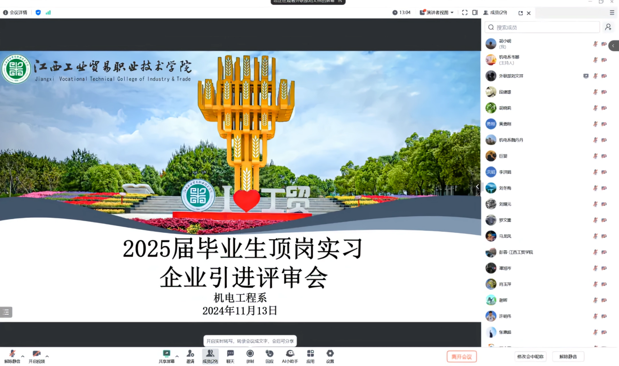 走访结束后,系部于11月13日晚19:30采取线上腾讯会议形式组织开展了2025届毕业生顶岗实习企业引进评审会,会议针对线上线下走访企业进行评审。机电工程系主任马龙凤、副主任刘耀元、晏慧敏以及机电系全体教职工参加会议,系就业管理员张惠超主持会议。