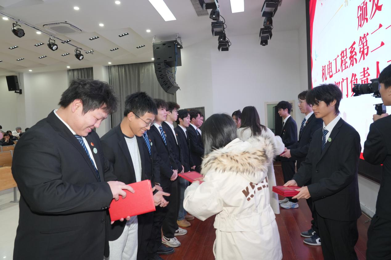 老师们为第二十届的干部们颁发纪念奖品和荣誉证书。并对即将毕业的学生干部寄语:在工作岗位上也要时刻牢记出彩机电人的优良品质,以梦为马,不负韶华。