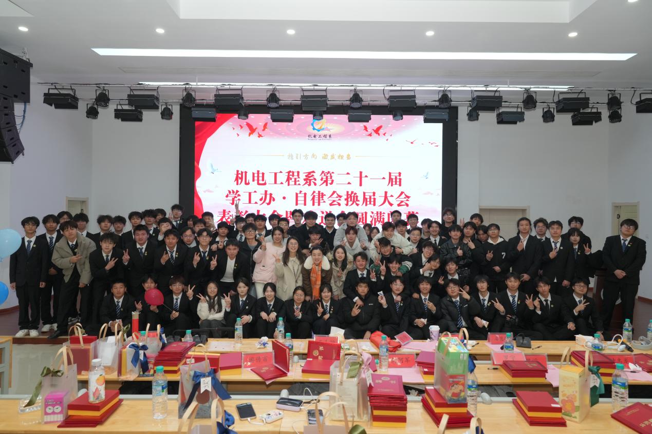 机电工程系第二十一届学工办·自律会学生代表大会于2024年12月13日召开。出席人员有机电工程系学生工作副主任晏慧敏、学生管理员周训会、团总支书记王卉怡、系专职辅导员徐悦欣、各院系自律会代表、机电工程系自律会各部门成员、各班级学生代表。
