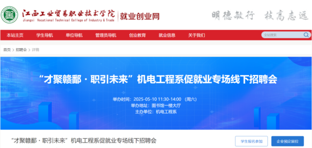 尊敬的用人单位: 衷心感谢贵单位长期以来对学院机电工程系毕业生就业工作的高度重视与鼎力支持。 为深入贯彻落实党中央、国务院关于高校毕业生就业工作的决策部署,积极响应江西省“人才留赣”战略,进一步深化校企合作,搭建精准对接平台,促进机电工程领域人才高质量就业,学院机电工程系定于2025年5月10日举办“才聚赣鄱・职引未来”机电工程系促就业专场线下招聘会。