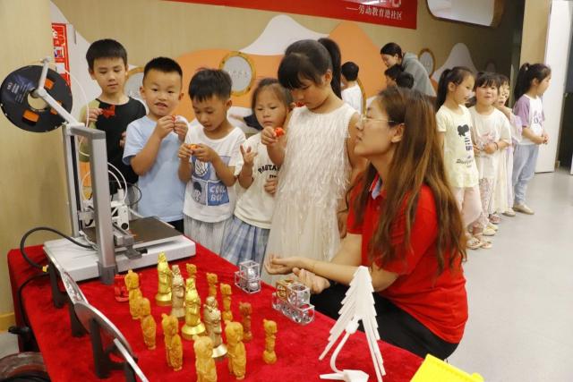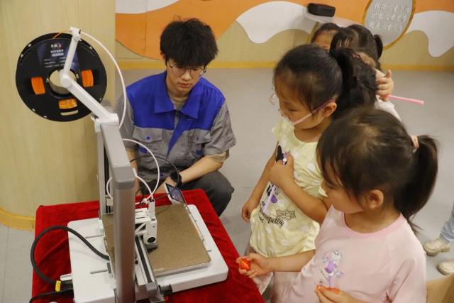 活动现场,学生同步进行3D 打印技术实操展示,他们熟练操控设备为社区居民定制打印个性化小礼品,从精致的卡通摆件到实用的生活小物件,层层堆叠的打印过程吸引众多居民驻足观看。