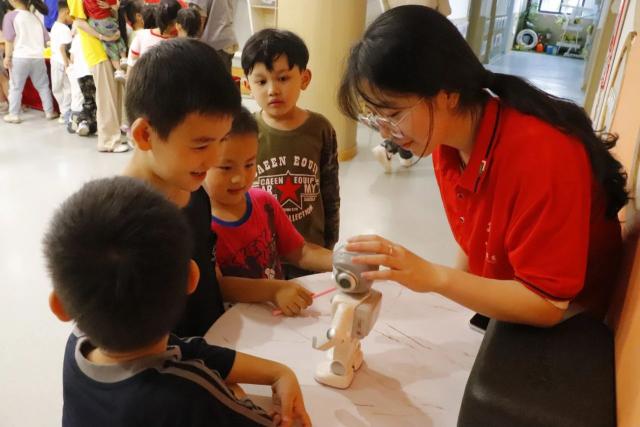 活动中,学生精心打造的小型机器人、自动化生产线模型等多元机械装置亮相展示现场,而最吸睛的当属智能机器人,如同从科幻世界走出的小精灵,引得幼儿园孩子们的目光紧紧追随。当机器人头顶屏幕突然亮起,轻快的歌曲旋律瞬间点燃全场气氛。孩子们自发地跟着音乐摇摆身体,现场充满欢乐的氛围。 在展示环节,学生通过动态演示与专业讲解相结合的方式,深入浅出地剖析机械工程的运行原理与实际应用场景,带领幼儿园师生沉浸式感受机械制造的魅力,有效激发孩子们对该领域的探索热情与求知兴趣。