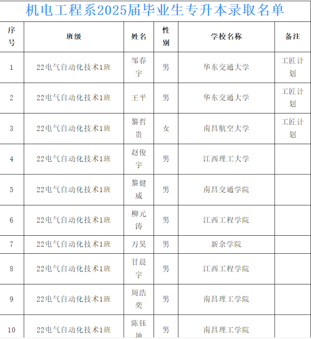 辛勤耕耘结硕果,机电学子谱华章。近日,2025年江西省普通高等教育专升本招生录取陆续完成,机电学子捷报频传,专升本成绩喜人。我系2025届高职学生共有213位应届毕业生怀揣着对更高学府的向往,踊跃报名参加了2025年普通高等教育专升本考试。经过激烈的竞争,截至目前,已有174名应届毕业生凭借自身扎实的专业知识和过硬的综合素质,成功被省内各大高校录取,录取率高达81.7%,这一成绩充分彰显了我系学子的卓越实力和良好风貌。 尤为值得一提的是,在第一批次录取中,工匠强省计划录取人数达21人,创我系工匠强省计划录取人数历史新高。这不仅是对我系学子专业素养的高度认可,更是对我系人才培养模式和教育教学成果的有力证明。 以下是我系2025年专升本考试录取情况统计表,让我们一同见证这份来之不易的荣耀: