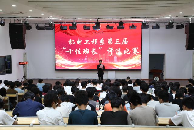 为深入践行“五育并举”全面发展育人理念,进一步加强学生骨干队伍建设,发挥榜样示范引领作用。表彰在班级建设中表现卓越、发挥关键作用的班长们,树立先进典型,激发榜样力量,凝聚集体向心力、加强班级建设,机电工程系于6月开展第三届“十佳班长”评选活动。 崭露头角各展风采 本次大赛分为初赛和决赛两个环节。具体评分标准如下:班级每月班竞分数(40%)+班级班长参加院(系)比赛获奖情况(20%)+学期末班长展示答辩(30%)+综合印象(10%)=最终总分,确保比赛过程的公平、公正、公开。 初赛于5月28日在厚泽楼322举行。由系自律会会长、主席团成员及各部门学生干部代表担任评委。33名班长根据抽签顺序依次上台述职,评委现场对选手进行提问。 选手们通过图文并茂的PPT演讲,展示了各自在班级制度建设、学分营造、活动组织和团队凝聚等方面的独特思路、创新举措和显著成效。充分展现了智慧、责任与担当。