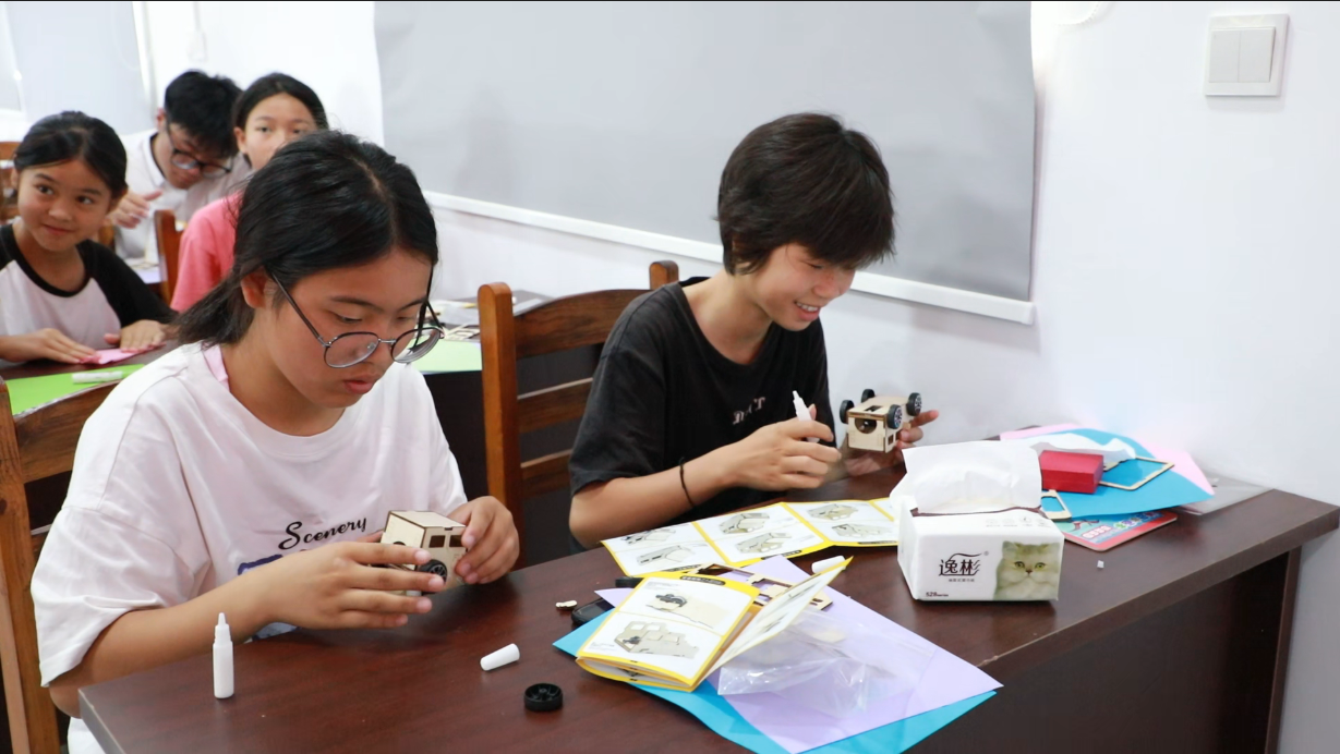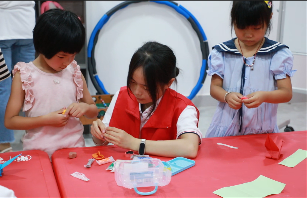 巧手塑童梦清辉映赤忱 “光明”实践团的成员们正俯身轻握孩子们的小手,耐心引导他们折叠手中的卡纸。另一边,有的孩子正全神贯注地揉捏着陶泥,有的握着画笔,在白纸上涂抹着天马行空的想象;还有的则专注地拼装着零件,一辆辆小汽车初具雏形。 那一张张写满专注与兴奋的小脸,无声地汇入实践团成员的心间,让他们真切感受到这份付出的无价。