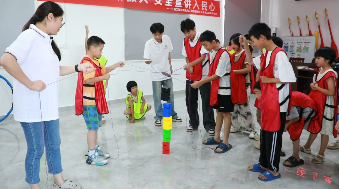 小手相递圈稚肩共筑塔 “光明”实践团的成员们还为小朋友们精心设计了趣味十足的素质拓展活动。在哥哥姐姐们的引导下,孩子们从组队推选小队长,到分组投入“一圈到底”、“合力建塔”等协作游戏中,现场气氛热烈而温馨。 当团队默契配合,在最短时间内成功完成挑战时,稚嫩的欢呼声瞬间爆发;而当搭建中的“高塔”不慎摇晃倾覆,没有埋怨,只有伙伴间及时的鼓励和重新投入的专注眼神。孩子们在欢乐的汗水中,真切体会到了“我们在一起”的力量,团队协作的种子悄然萌芽。 一张张灿烂的笑脸,是收获最好的证明,而场边家长欣慰的笑容和频频竖起的大拇指,更是对实践团成员用心付出的无声赞誉。