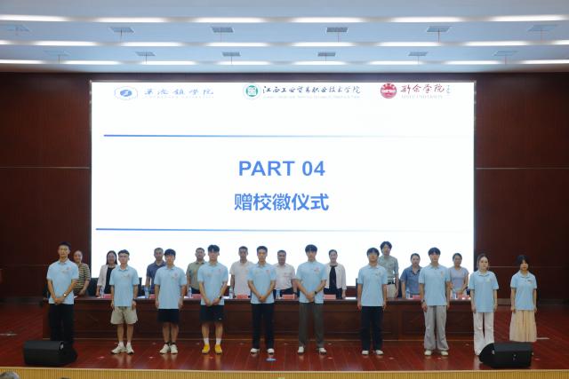 最后,双方老师共同为新生代表佩戴校徽。接过承载着两校精神的校徽,新生代表们神情庄重,双手捧校徽向领导鞠躬致谢。校徽不仅是学院间联合培养的象征,更寄托着对新生“身份转变、责任担当”的期许,标志着新生正式开启本科阶段的学习与成长。