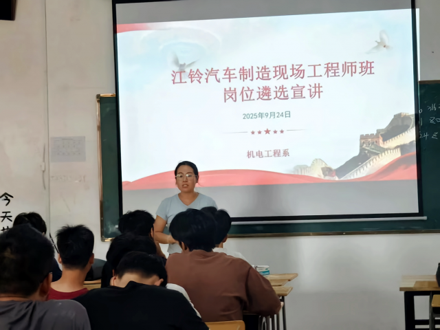 2024年9月24日,江铃汽车制造现场工程师学院面向现场工程师班学生宣讲机电设备检修运维岗、生产制造与工艺优化岗、质量检验与优化岗、智能产线运维岗四个岗位工作内容及标准,并组织遴选100名学生。 机电设备检修运维岗,负责区域内机电设备(如机床、动力系统、传送带、机器人等)的日常点检、定期保养、润滑、紧固等工作,确保设备处于良好状态,需要掌握机械原理、电气控制、液压与气动等专业知识,能读懂机械图纸和电气原理图,熟练使用各种维修工具、仪器仪表,具备较强的机械拆装和电气接线能力。 生产制造与工艺优化岗,熟悉并严格执行产品生产工艺流程、操作规程和作业指导书,掌握机械加工、装配工艺、材料学基础,了解精益生产、工业工程(IE)等基本理念,掌握基本的质量问题工具(如5Why, 鱼骨图),能系统性分析工艺问题。 质量检验与优化岗,依据图纸、标准和检验规程,使用量具、检具及检测设备,对原材料、在制品、成品进行尺寸、外观和性能检验。掌握几何尺寸与公差(GD&T)、质量控制图、抽样检验标准等质量管理知识,熟练操作游标卡尺、千分尺、高度规、三坐标测量机等常用检测设备。 智能产线运维岗,负责监控自动化产线、工业机器人、AGV等智能设备的整体运行状态,具备跨学科知识,了解机械、电气、自动化、工业网络及数据采集(SCADA/MES)的基本原理,掌握基本的PLC梯形图/结构化文本阅读能力,了解工业机器人编程基础,熟悉常见的工业通信协议。 一位参与宣讲的同学会后兴奋地表示:“之前对‘现场工程师’的理解很模糊,今天终于知道了具体要做什么、需要具备什么能力。这不再是纸上谈兵,而是一份充满挑战与成就感的职业蓝图。”