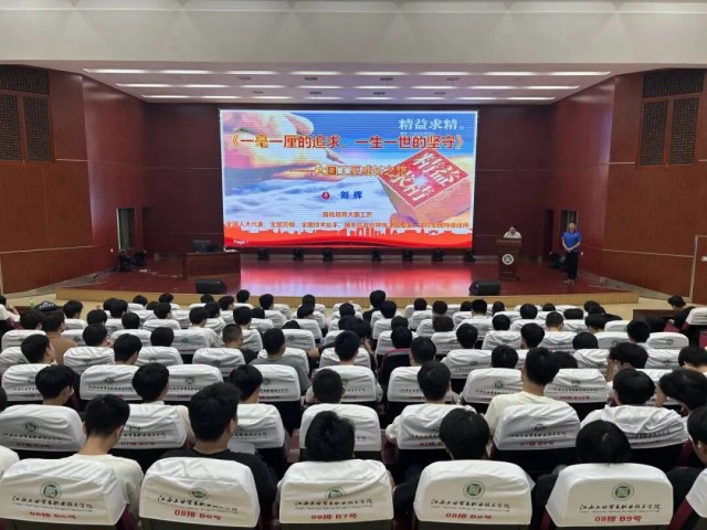 为大力弘扬劳模精神、工匠精神,激励广大青年学子技能报国,9月31日,机电工程系特邀全国技术能手、全国人大代表、南昌市首位“大国工匠”刘辉走进校园,为2025级新生带来一场题为“奋斗的青春最美丽”的精彩讲座。 讲座中,刘辉代表结合自身从一名普通技术工人成长为“大国工匠”的奋斗历程,用朴实而真挚的语言,分享了他在平凡岗位上追求卓越、刻苦钻研的感人事迹。他生动地阐述了“爱岗敬业、争创一流、艰苦奋斗、勇于创新、淡泊名利、甘于奉献”的劳模精神内涵,并鼓励同学们要珍惜在校时光,夯实专业基础,培养创新思维,将个人理想融入国家发展的宏伟蓝图。
