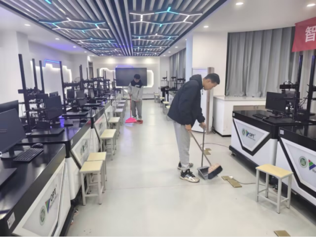 活动期间,同学们分组对数控加工区、视觉实训室、机电一体化工作站等场所进行深度清洁与基础维护。大家仔细擦拭设备表面、整理线路管线、规整工具耗材、清扫作业区域,确保实训环境安全、整洁、有序。在动手实践中,同学们不仅进一步熟悉了专业设备的构成与保养要点,更在团队协作中体会到“一丝不苟、精益求精”的工匠内涵。