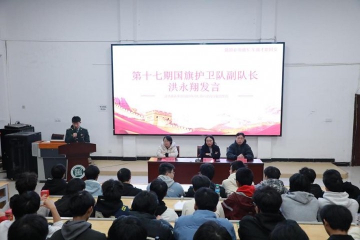 在场同学深受触动,在后续的问答互动环节踊跃参与,就加入国旗护卫队的条件、流程以及应征入伍政策等积极提问交流。 最后,机电工程系学生工作负责人陈欢作总结讲话。她强调,国旗是国家的象征、民族的灵魂,护卫国旗不仅是一份光荣,更是一份沉甸甸的责任。她指出,在国旗护卫队中,同学们将接受系统的队列训练、仪式规范与爱国主义教育;将与志同道合的伙伴并肩前行,锤炼意志、强健体魄、升华品格;将以庄严的姿态和整齐的步伐,让五星红旗在校园高高飘扬,展现新时代青年的昂扬风貌。她向与会同学提出三点期望:一是要厚植家国情怀,坚定理想信念;二是要锤炼过硬本领,勇于吃苦奉献;三是要扛起青春担当,以实际行动守护国旗尊严、传承红色基因。