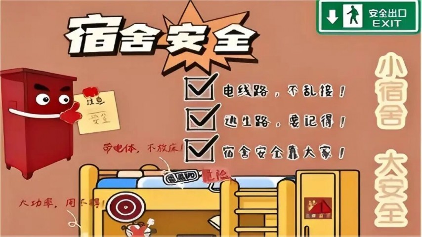 四、 宿舍和睦,安全为要 自觉遵守宿舍管理制度,配合管理检查。杜绝使用违规电器、明火设备,不私拉电线,不存放易燃易爆物品。保持宿舍整洁卫生,不留宿外来人员,共同营造安全、温馨的居住环境。