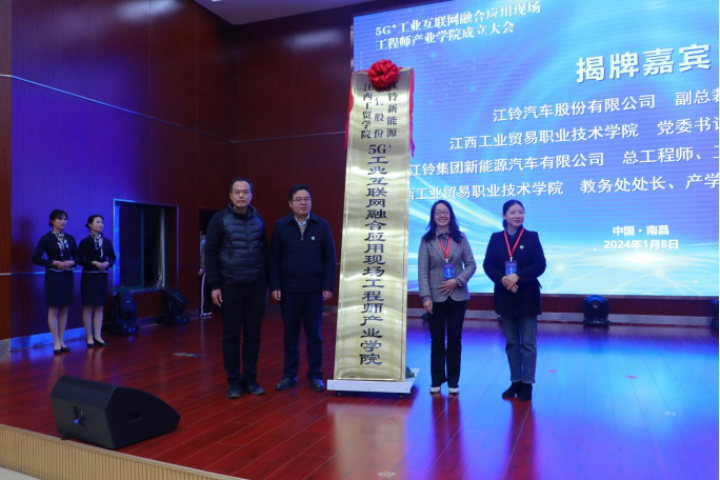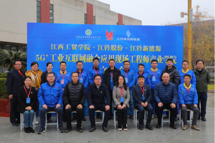 1月8日,江西工业贸易职业技术学院(以下简称工贸学院)与江铃汽车股份有限公司(以下简称江铃股份)、江西江铃集团新能源汽车有限公司(以下简称江铃新能源)在学院图文信息中心学术报告厅举行5G+工业互联网融合应用现场工程师产业学院成立大会暨第一期培养班开班仪式。江西工贸学院党委书记、院长万晓波,江铃股份副总许兰锋,江铃新能源总工程师、工程研究院院长姜筱华出席成立大会,学院教务处处长、产学研培发展中心负责人曾聪,机电工程系主任马龙凤,产学研培发展中心副主任黄梅,产业学院校企导师及学生代表等领导和嘉宾共计260余人参加会议。会议由学院党委委员、副院长宋小兵主持。