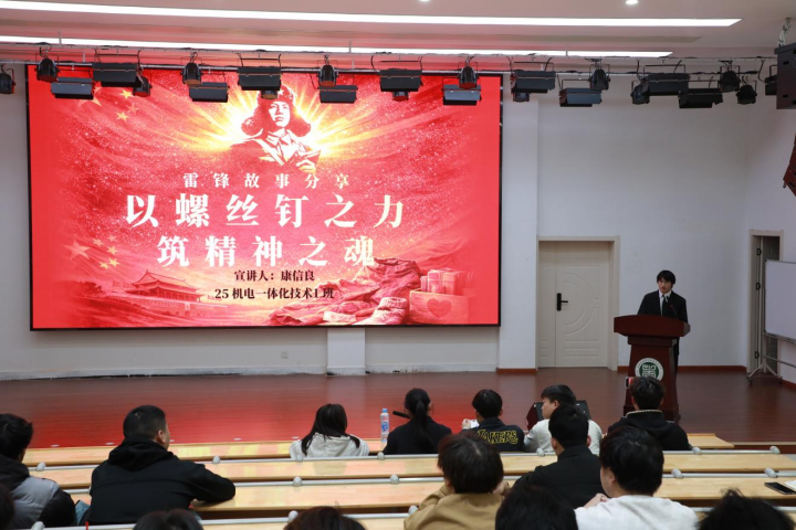 为传承与弘扬雷锋精神,引导青年学子践行奉献担当、涵养优良品德,近日,智能制造学院在志学楼505教室举办“学习雷锋好榜样,传递青春正能量”雷锋故事分享会。辅导员罗晓雯老师及学生代表参加活动,通过故事分享、知识竞答、榜样宣讲、集体宣誓等形式,让雷锋精神入脑入心、落地生根。 活动在雷锋事迹纪录片中拉开帷幕,珍贵影像与动人故事营造出庄重崇敬的氛围,带领同学们重温雷锋平凡而伟大的一生。 在雷锋故事分享环节,同学们深情讲述、真挚感悟。25机电一体化技术1班康信良以《以螺丝钉之力,筑精神之魂》为题,诠释了雷锋“干一行、爱一行、钻一行”的敬业精神,鼓励大家在平凡岗位坚守初心、精益求精;25工业互联网应用2班张君浩带来《甘当“傻子”的奉献人生》,讲述雷锋无私忘我、乐于助人的高尚品格,让同学们深刻理解奉献的价值与意义。两段分享主题鲜明、情感真挚,进一步深化了大家对雷锋精神“敬业、奉献、坚守、担当”核心内涵的认识。