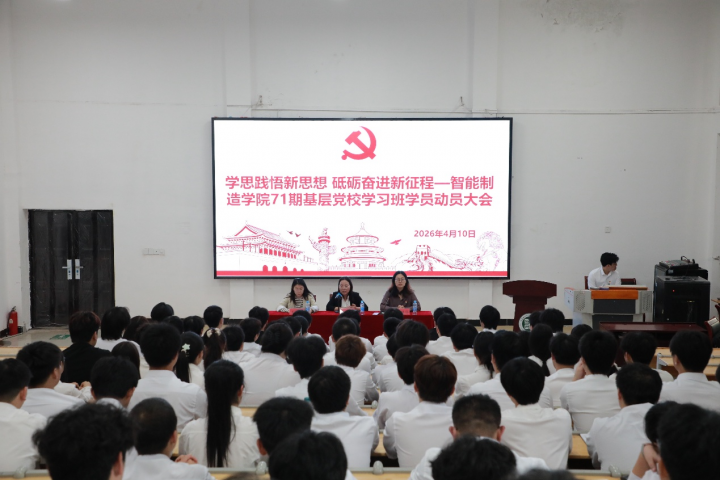 会上,陈欢为全体学员做动员讲话,她指出,2026年是“十五五”规划开局之年,也是学校开启国家“双高”专业群建设的攻坚之年和学校迎来70周年校庆,为同学们的政治成长创造了更广阔的平台。她向学员们提出四点要求:第一潜心研学,夯实理论根基,全身心投入培训,深入钻研党的理论知识,提升政治素养与思想境界;第二勤思善悟,坚持学用结合,做到学思践悟、学以致用,将理论知识转化为实际行动;第三严守纪律,恪守自律准则,遵守培训班规章制度,展现智造学院学子的优良作风;第四躬身实践,接受组织考验,在学习、生活和实践中践行党员标准,争取早日成为合格党员。 朱键华宣读了《关于举办基层党校第七十一期学习班的通知》,并介绍了本期培训班的基本情况、课程安排、学习要求及考核方式,帮助学员明确学习目标。她号召入党积极分子以饱满热情投入学习,走在前、做表率,提高政治理论水平和实践能力。随后,第70期优秀学员闫浩南结合自身经历,分享了党校学习中的收获与成长,勉励新学员珍惜机会、勤学善思,以实际行动向党组织靠拢。第71期学员代表谢江宏表示,将继承和发扬往期优良学风,严守纪律、躬身实践,努力提升政治素养,争取早日成为一名合格的共产党员。